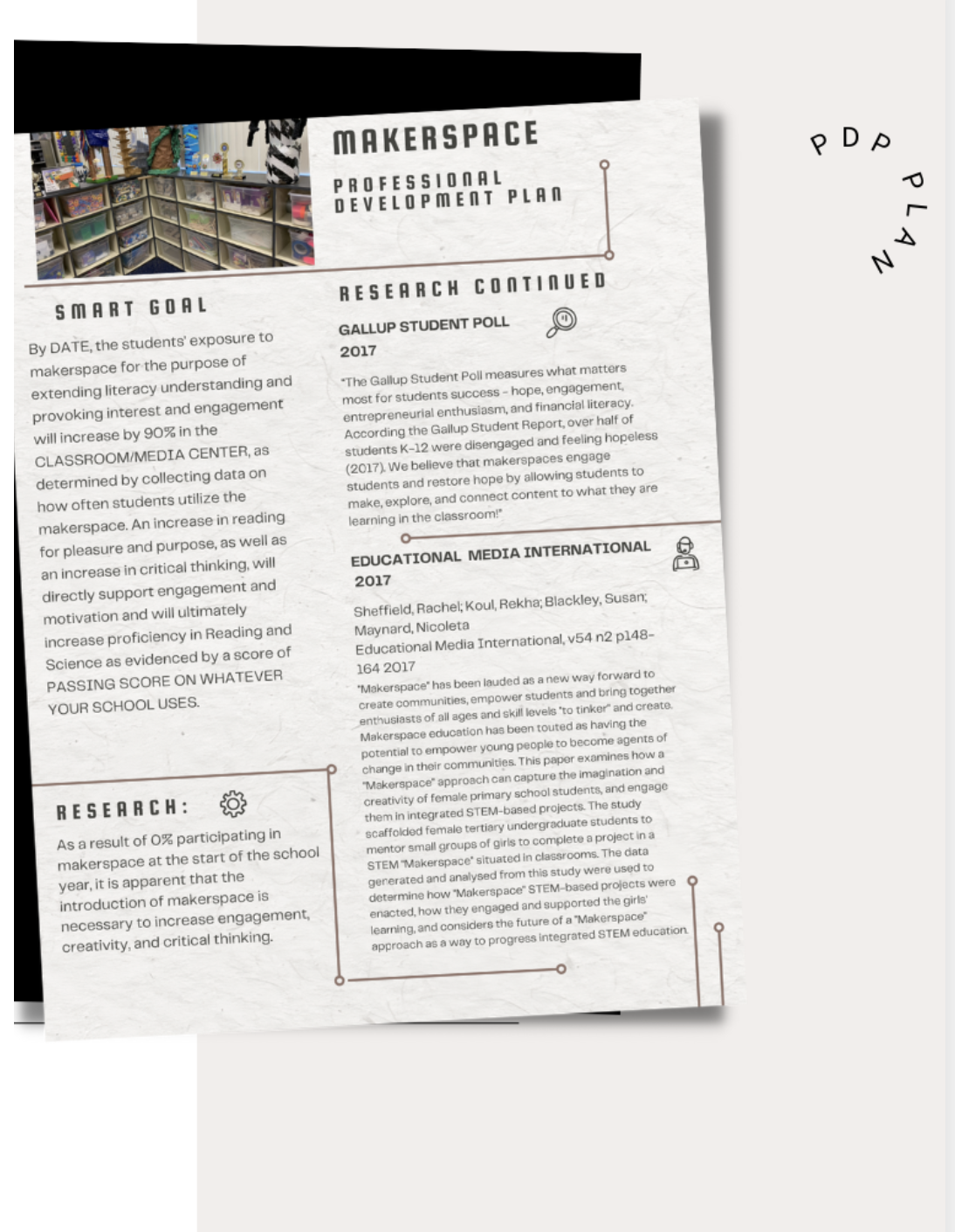 Makerspace Professional Development Plan Complete with a SMART goal, scholarly research, objectives, strategies and behaviors, and more! Download My PDP