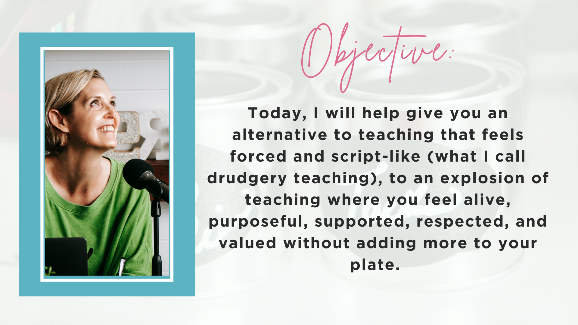 Today, I will help give you an alternative to teaching that feels forced and script-like (what I call drudgery teaching), to an explosion of teaching where you feel alive, purposeful, supported, respected, and valued without adding more to your plate.