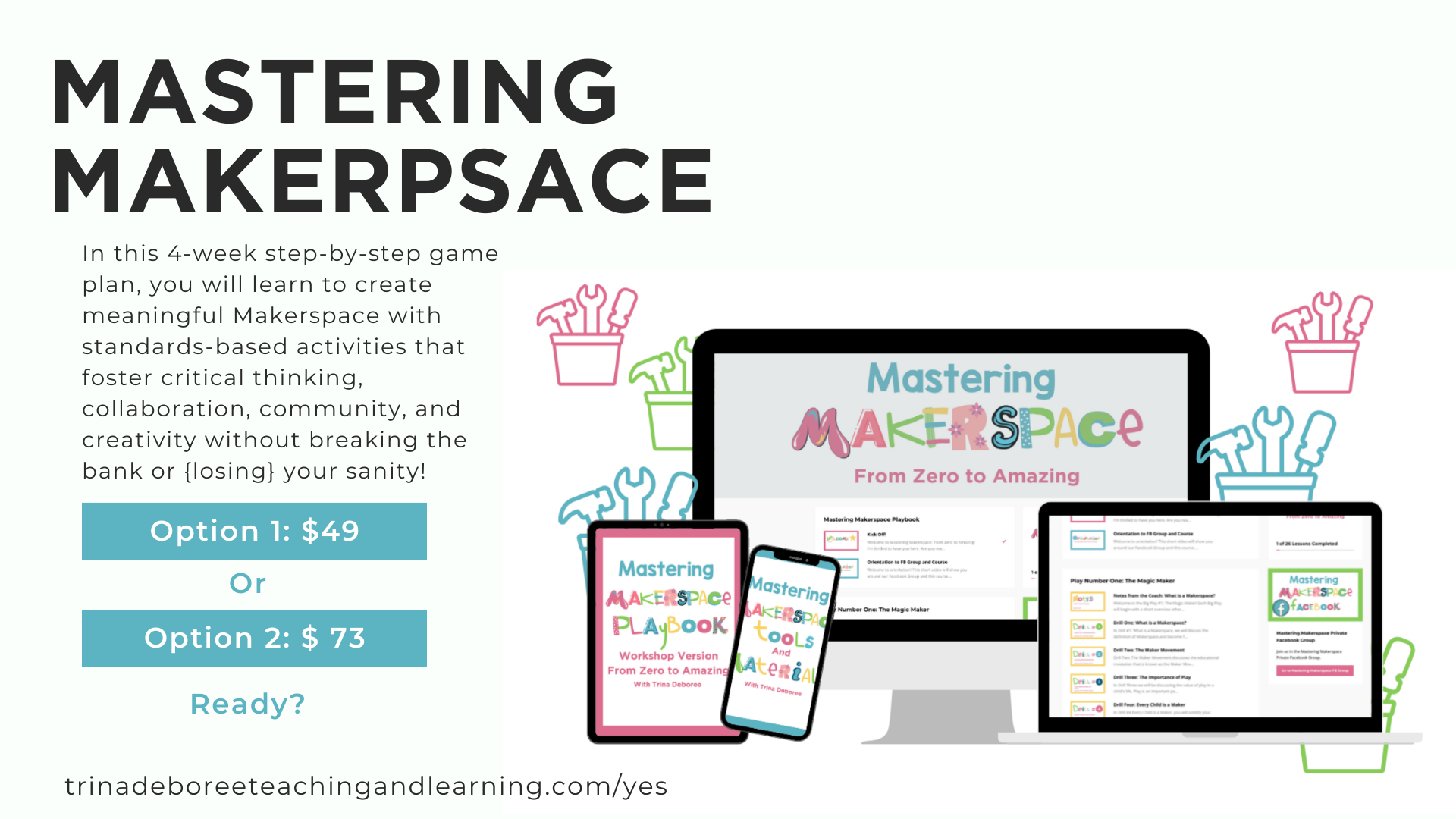 If you are ready to join Mastering Makerspace, this four-week step-by-step game plan, where you will learn to create meaningful Makerspace with standards-based activities that foster critical thinking, collaboration, community, and creativity without breaking the bank or {losing} your sanity, then hop on over to Mastering Makerspace: From Zero to Amazing.