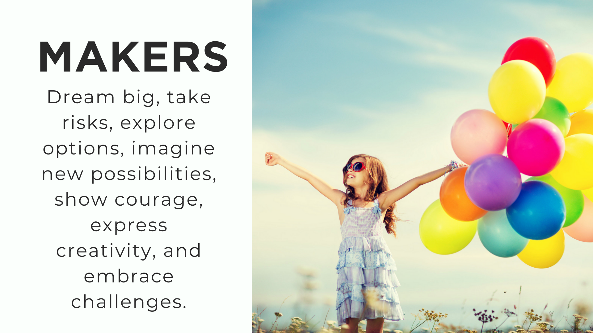 Makers dream big, take risks, explore options, imagine new possibilities, show courage, express creativity, and embrace challenges.