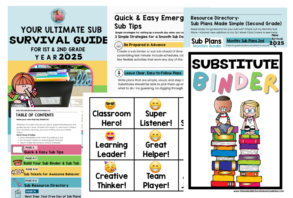 This sub guide contains free sub tickets to help with behavior, a sub binder cover, sub tips, and sub resources.